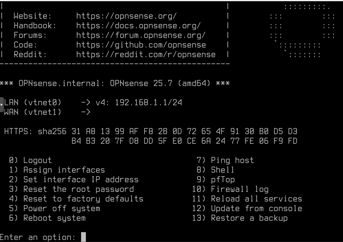 /Vezpi/Blog/raw/commit/4f152bf733df27dfc6b8b00c289cd18e735271a7/static/img/opnsense-vm-installation-cli-menu.png